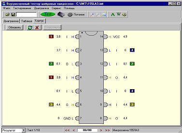 2. Проверка исходных логических состояний выводов микросхемы и наличие на них переключений (сигналов от внутреннего генератора тестируемого устройства), наличие выводов, подключенных к цепям питания, и выводов, соединённых между собой перемычками. Полученный результат выводится на дисплей в виде мнемосхемы объекта контроля.